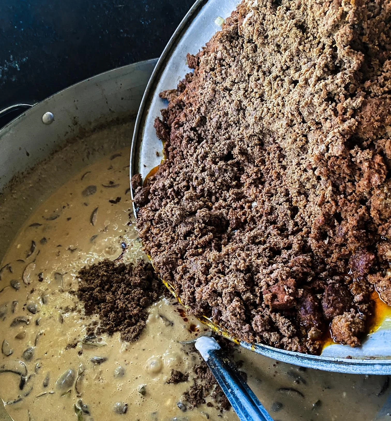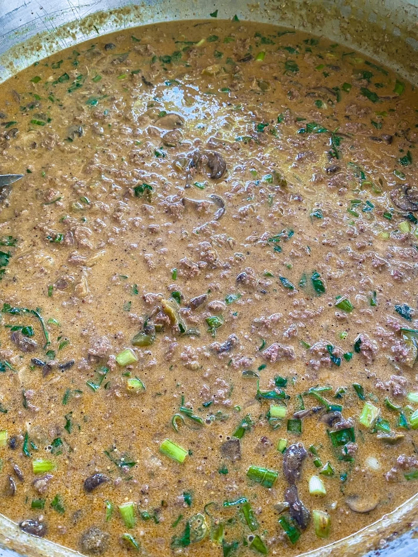 Add beef broth, Worcestershire sauce, Dijon mustard, bay leaves and whipping cream. Stir well then add the sour cream. (Tip: add some of the sauce from your pot to your sour cream in a separate bowl and stir before putting it in the sauce so it doesn’t separate) Then, add ground meat back to your pot.