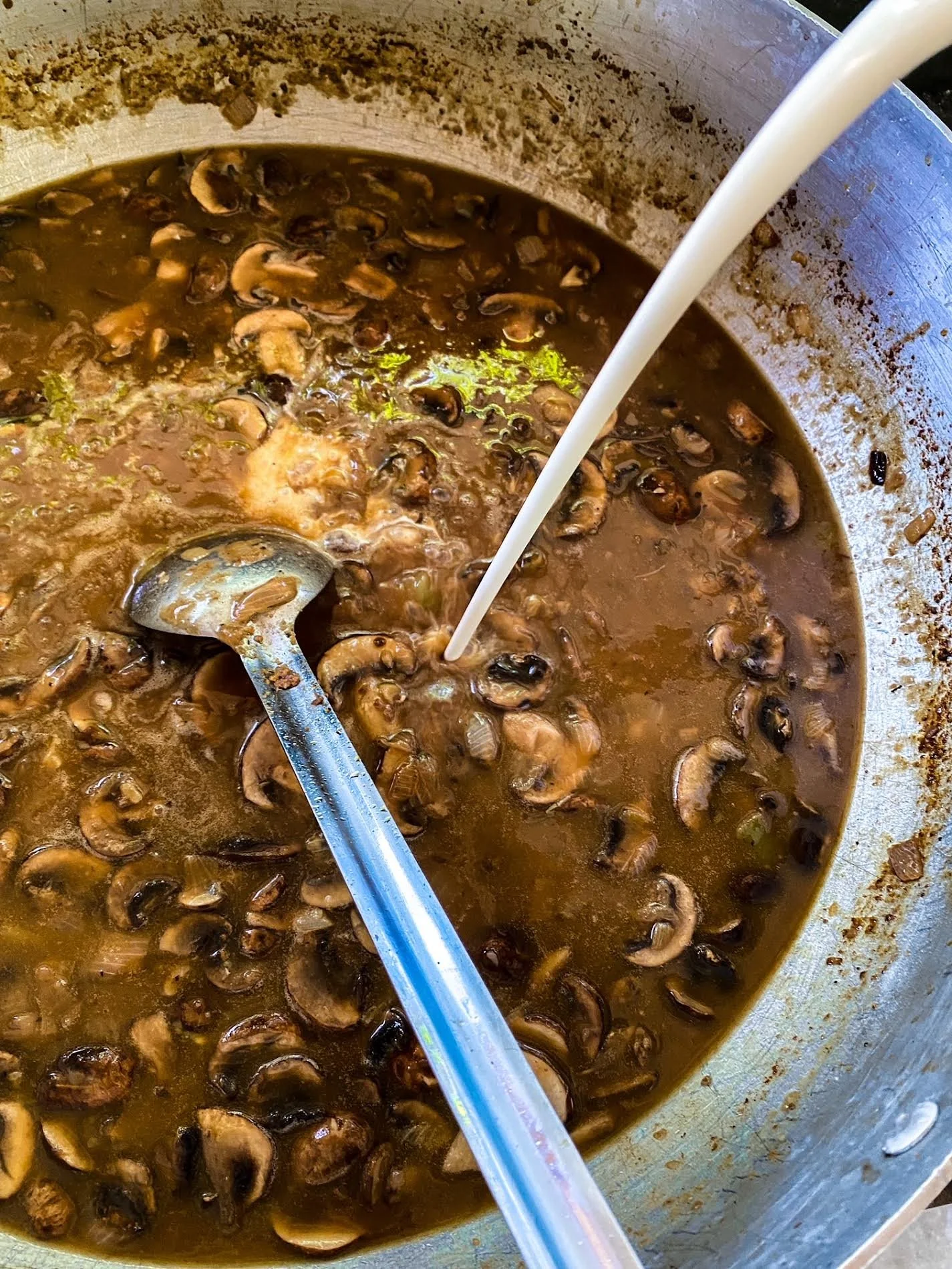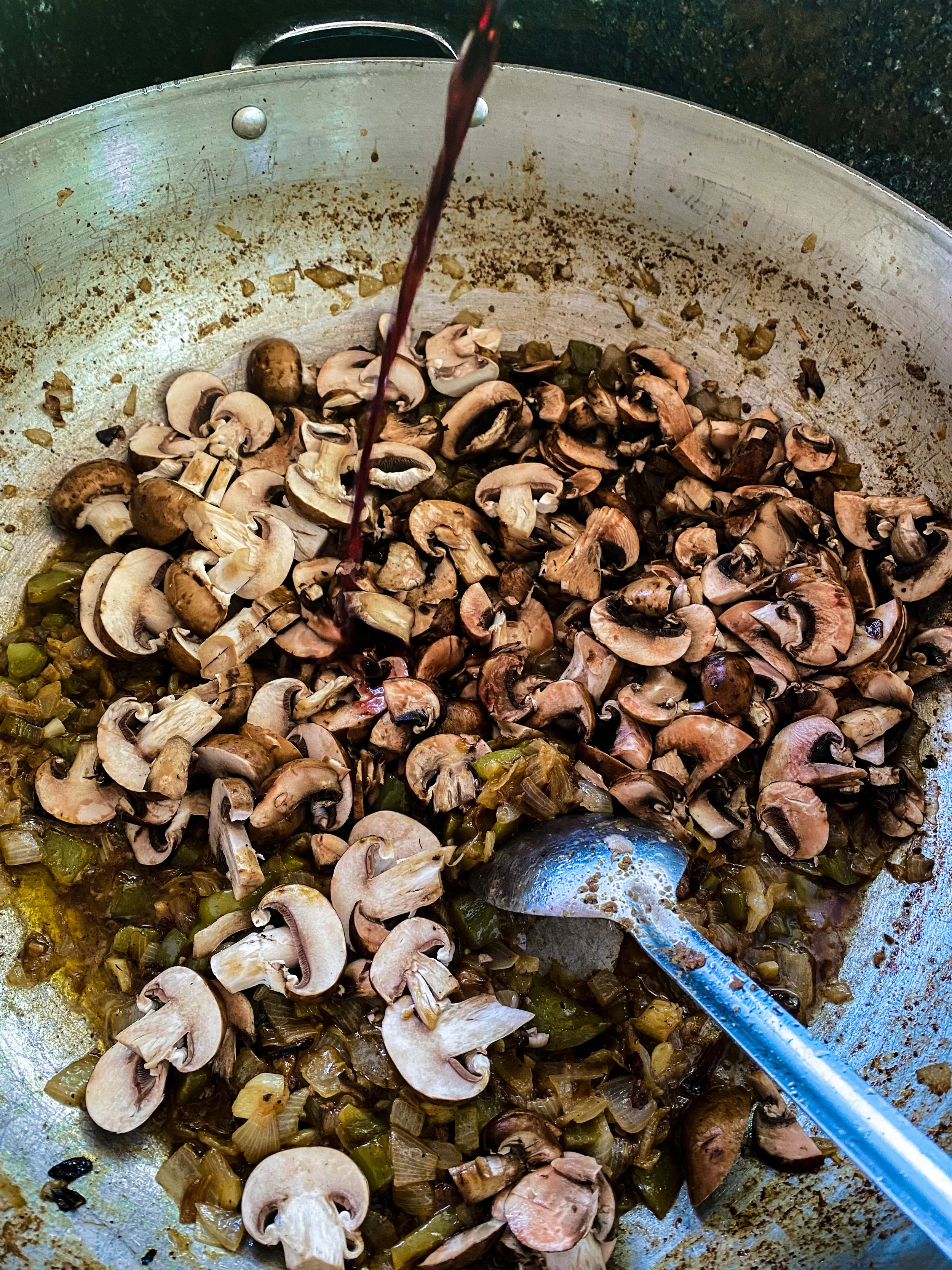 Then, add your mushrooms. I like to sauté the mushrooms in a little red wine (approximately half a cup or so).